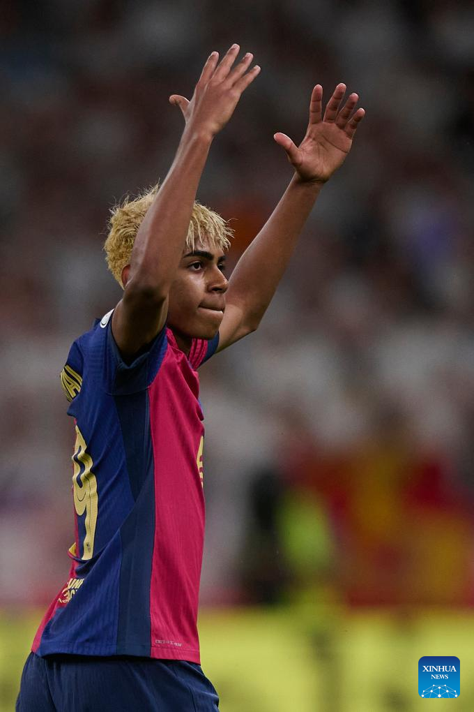 Lamine Yamal of FC Barcelona celebrates a goal during the Copa del Rey football match between FC Barcelona and Real Madrid, in La Cartuja Stadium, Seville, Spain, on April 26, 2025. (Photo by Pablo Morano/Xinhua)