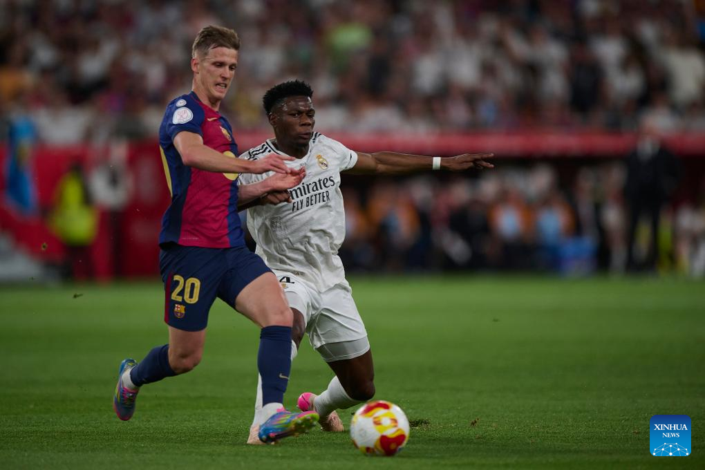 Dani Olmo (L) of FC Barcelona vies with Aurelien Tchouameni of Real Madrid during the Copa del Rey football match between FC Barcelona and Real Madrid, in La Cartuja Stadium, Seville, Spain, on April 26, 2025. (Photo by Pablo Morano/Xinhua)