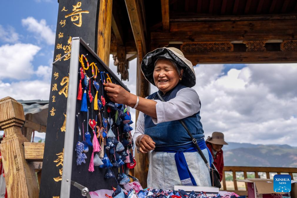 An elderly woman of Bai ethnic group arranges embroidered sachets at Hualong Village of Shaxi Town, Jianchuan County, southwest China's Yunnan Province, April 20, 2025. A remote town in Jianchuan County, Shaxi was once an important trading hub for tea, herbs, silks and salt on the ancient Tea Horse Road, a trade route dating back to the Tang Dynasty (618-907).