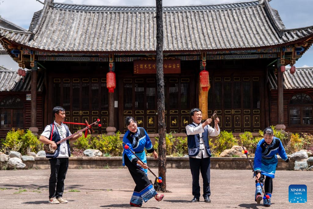 Villagers practice a folk dance in Shilong Village of Shaxi Town, Jianchuan County, southwest China's Yunnan Province, April 19, 2025. A remote town in Jianchuan County, Shaxi was once an important trading hub for tea, herbs, silks and salt on the ancient Tea Horse Road, a trade route dating back to the Tang Dynasty (618-907).