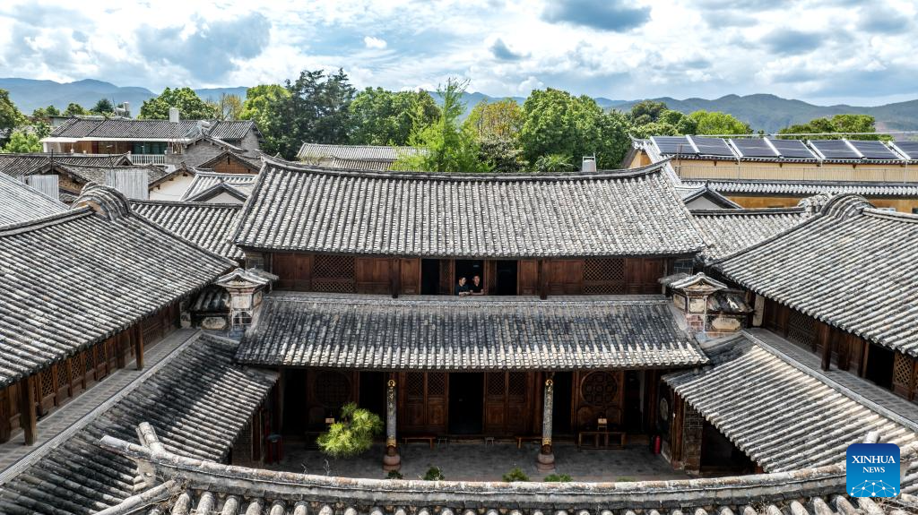 An aerial drone photo taken on April 19, 2025 shows a historical building that used to be a hostel at Sideng Village of Shaxi Town, Jianchuan County, southwest China's Yunnan Province. A remote town in Jianchuan County, Shaxi was once an important trading hub for tea, herbs, silks and salt on the ancient Tea Horse Road, a trade route dating back to the Tang Dynasty (618-907).