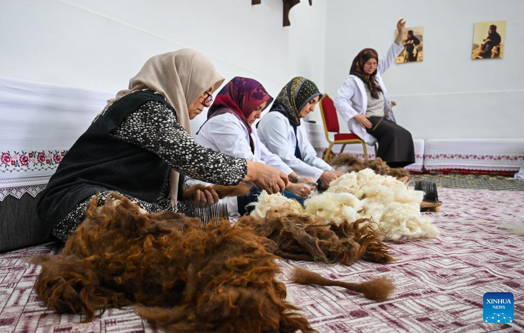 This photo taken on April 25, 2025 shows raw materials of wool at the Erzurum Maturation Institute in Erzurum, Türkiye. Erzurum, a province in northeastern Türkiye, has a long-standing tradition of wool weaving. Since the 1850s, Ehram, a finely spun wool fabric, has become a renowned local specialty. The production of Ehram involves multiple intricate processes. Initially utilized for women's garments, it has since been adapted for a variety of accessories, including handbags and belts. In recent years, the local government has actively promoted and supported the transmission and training of this textile craft to create more employment opportunities. (Xinhua/Liu Lei)