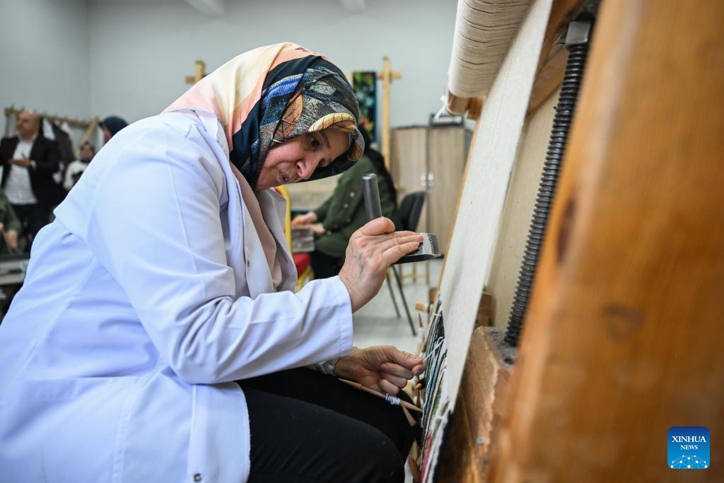 A worker does textile work at the Erzurum Maturation Institute in Erzurum, Türkiye, on April 25, 2025. Erzurum, a province in northeastern Türkiye, has a long-standing tradition of wool weaving. Since the 1850s, Ehram, a finely spun wool fabric, has become a renowned local specialty. The production of Ehram involves multiple intricate processes. Initially utilized for women's garments, it has since been adapted for a variety of accessories, including handbags and belts. In recent years, the local government has actively promoted and supported the transmission and training of this textile craft to create more employment opportunities. (Xinhua/Liu Lei)