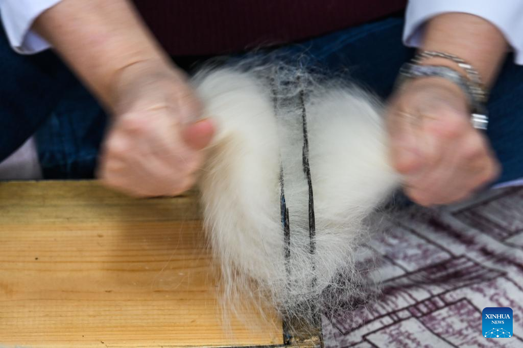 A worker combs wool with a special comb at the Erzurum Maturation Institute in Erzurum, Türkiye, on April 25, 2025. Erzurum, a province in northeastern Türkiye, has a long-standing tradition of wool weaving. Since the 1850s, Ehram, a finely spun wool fabric, has become a renowned local specialty. The production of Ehram involves multiple intricate processes. Initially utilized for women's garments, it has since been adapted for a variety of accessories, including handbags and belts. In recent years, the local government has actively promoted and supported the transmission and training of this textile craft to create more employment opportunities. (Xinhua/Liu Lei)