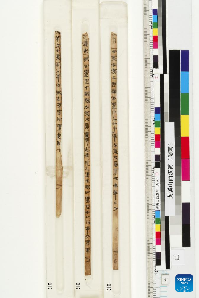 This undated file photo shows bamboo slips recording recipes in a manuscript titled "Shi Fang," an ancient text dating back to the Western Han Dynasty (202 BC-8 AD), in Changsha, central China's Hunan Province. (Changsha Jiandu Museum/Handout via Xinhua)