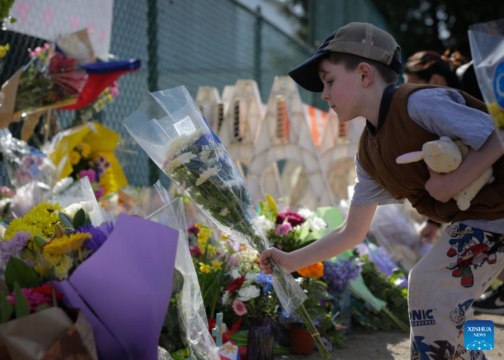 A boy lays flowers near the site of a car crash in Vancouver, British Columbia, Canada, April 27, 2025.