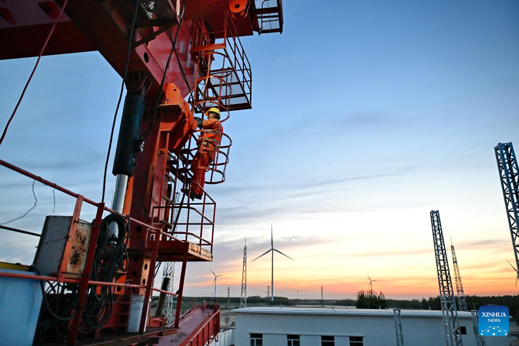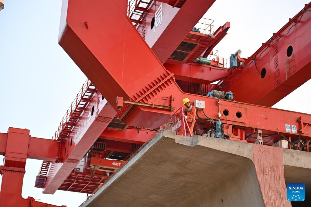 A worker erects a box girder at the construction site of a mega bridge in the Hebei section of the Xiong'an-Shangqiu high-speed railway in north China's Hebei Province, April 27, 2025. Girder erection work in the Hebei section of Xiong'an-Shangqiu high-speed railway was fully completed on Sunday as the last box girder was erected on a mega bridge. The 552-kilometer-long railway will connect Xiong'an in north China's Hebei Province and Shangqiu in central China's Henan Province with a designed speed of 350 kilometers per hour. (Xinhua/Mu Yu)
