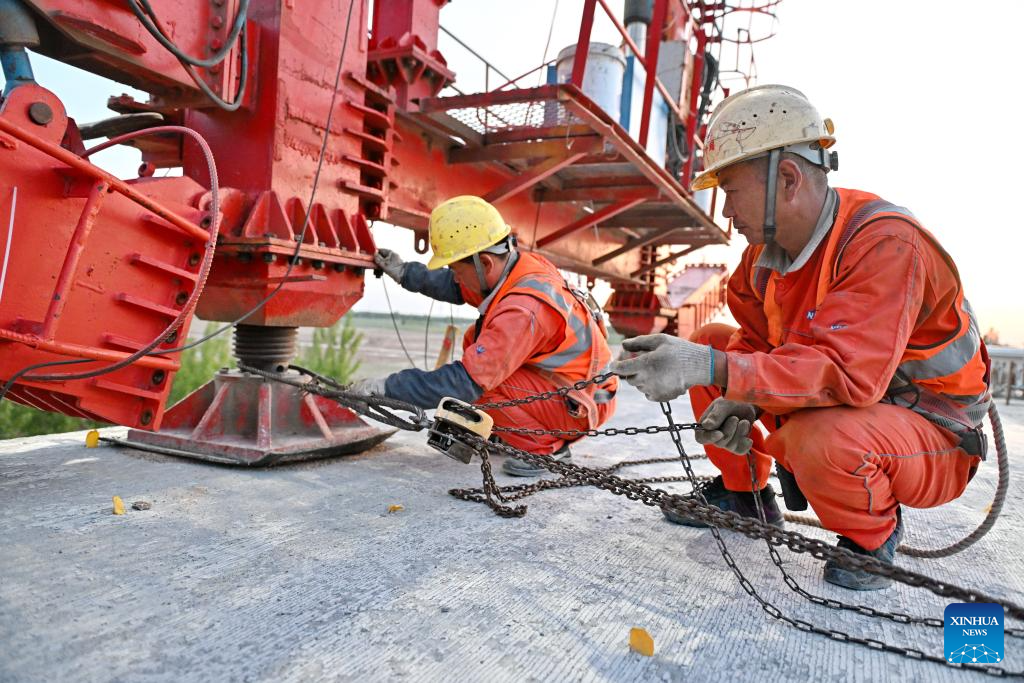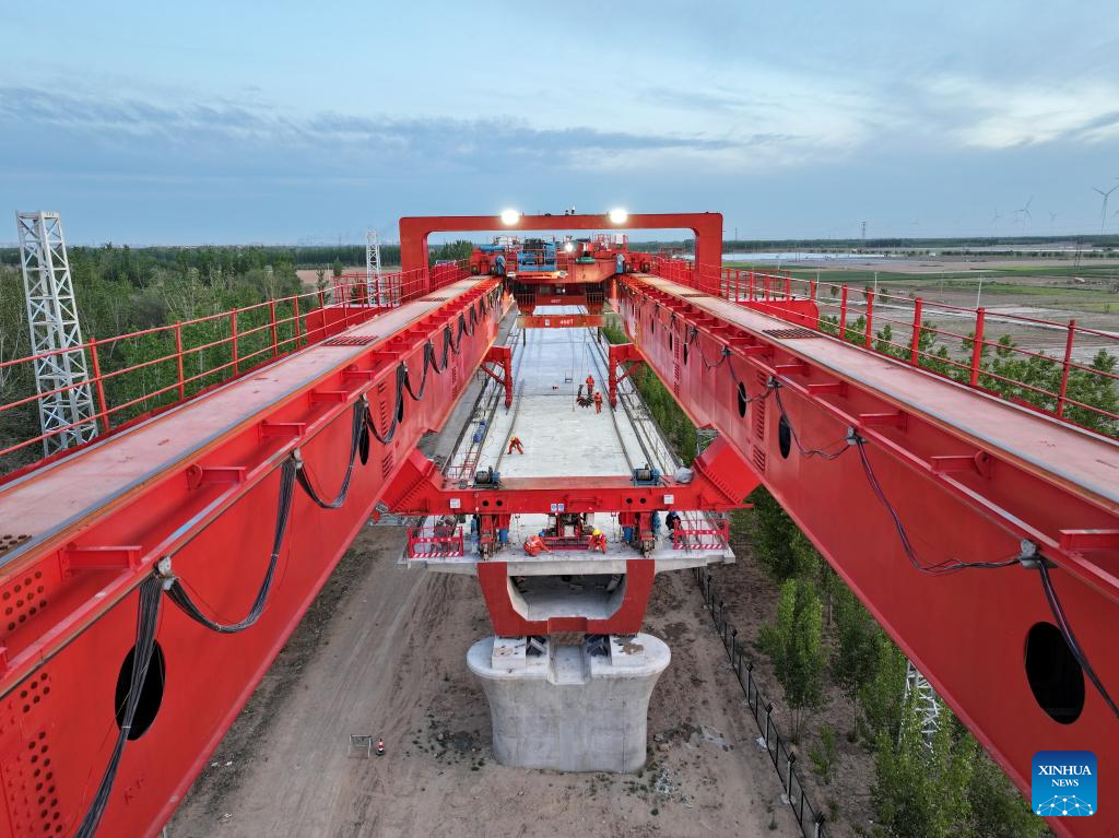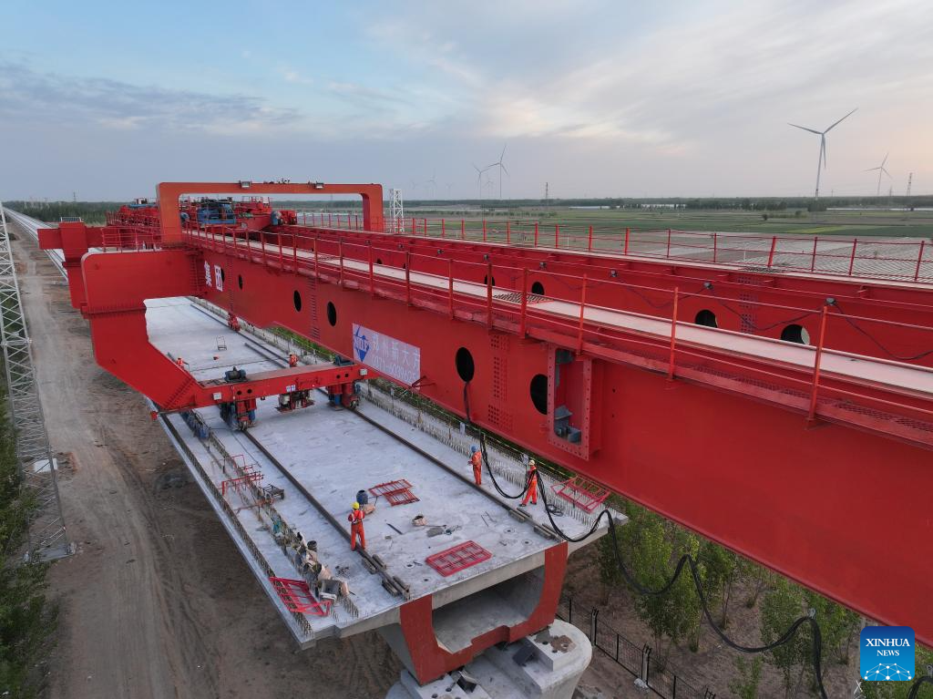 Workers erect a box girder at the construction site of a mega bridge in the Hebei section of the Xiong'an-Shangqiu high-speed railway in north China's Hebei Province, April 27, 2025. Girder erection work in the Hebei section of Xiong'an-Shangqiu high-speed railway was fully completed on Sunday as the last box girder was erected on a mega bridge. The 552-kilometer-long railway will connect Xiong'an in north China's Hebei Province and Shangqiu in central China's Henan Province with a designed speed of 350 kilometers per hour. (Xinhua/Mu Yu)