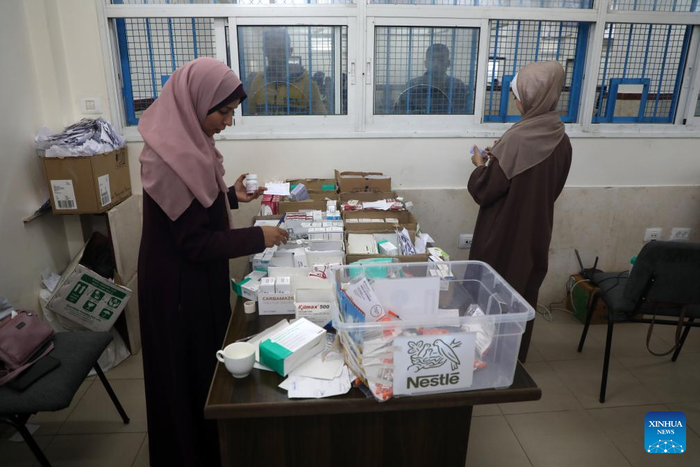 Palestinians work at a United Nations Relief and Works Agency for Palestine Refugees in the Near East (UNRWA) health center, west of Gaza City, amid a shortage of medicine due to Israel's continued closure of the border crossings in the Gaza Strip, on April 28, 2025. (Photo by Rizek Abdeljawad/Xinhua)