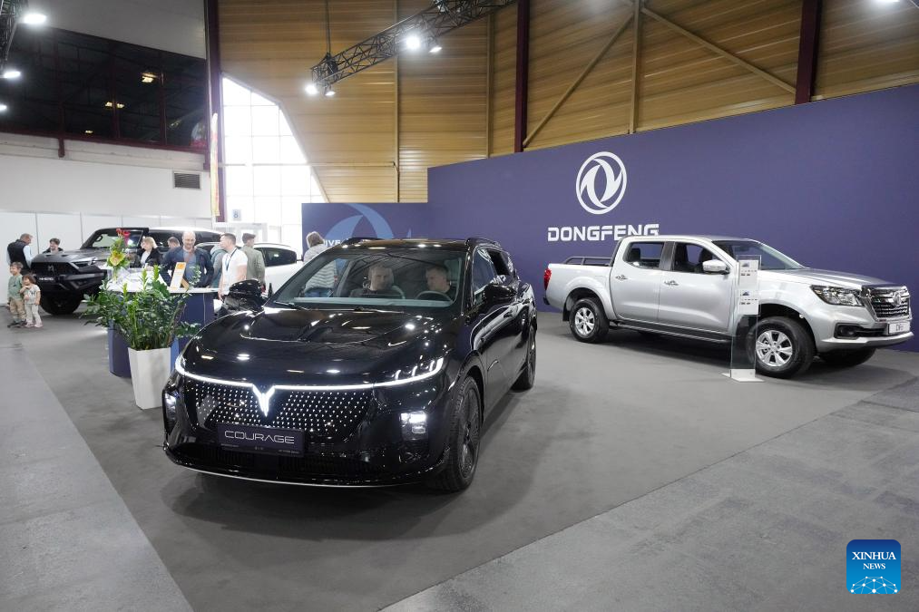 This photo taken on April 27, 2025 shows the booth of Chinese automaker Dongfeng during the Baltic Motor Show Riga "Auto 2025" in Riga, Latvia. (Photo by Edijs Palens/Xinhua)