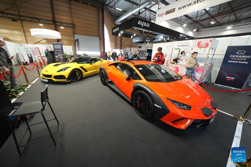 People visit the Lamborgini booth during the Baltic Motor Show Riga "Auto 2025" in Riga, Latvia, April 27, 2025. (Photo by Edijs Palens/Xinhua)