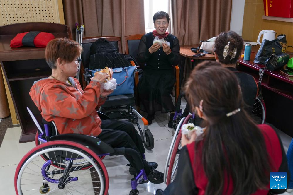 Song Aixia (2nd L) and teammates have lunch before performing wheelchair dance for community residents in Nanjing, east China's Jiangsu Province, April 27, 2025.