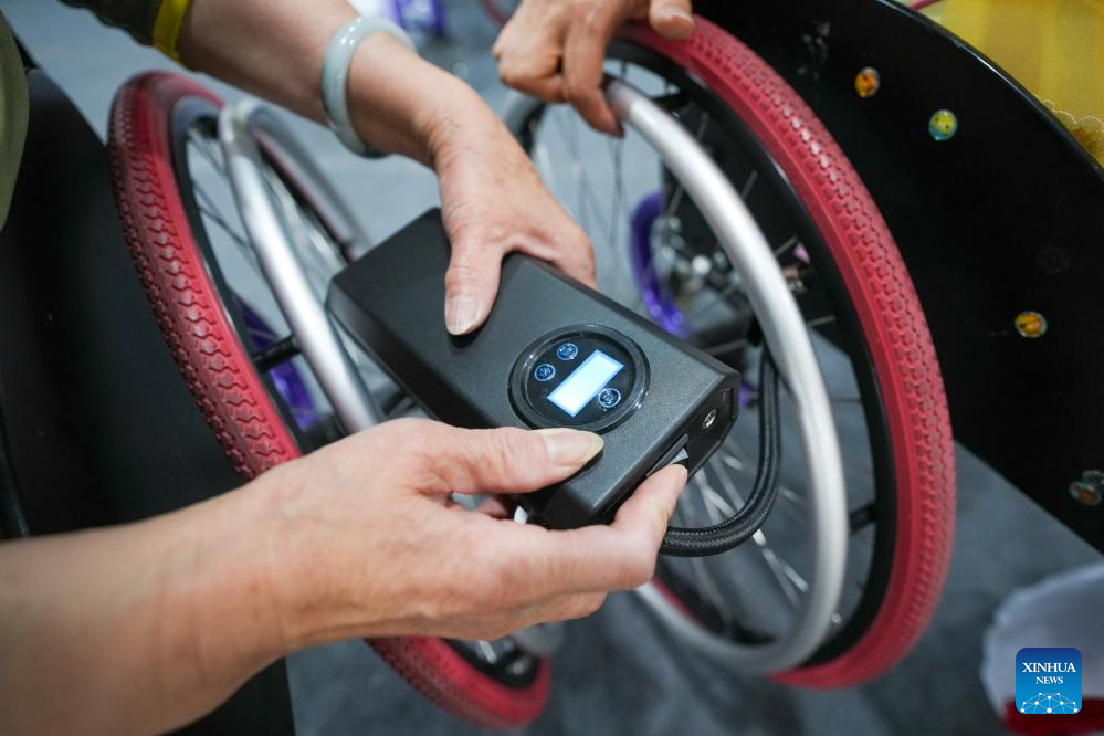 Members of a wheelchair dance team pump up wheelchair tires ahead of performance in Nanjing, east China's Jiangsu Province, April 27, 2025.