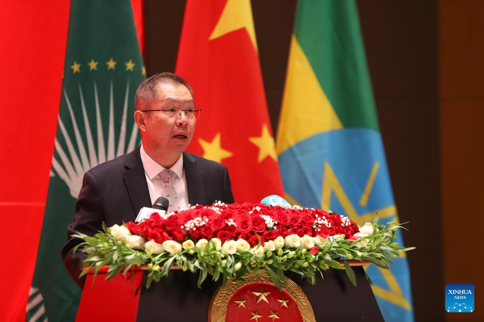 Hu Changchun, head of the Chinese Mission to the African Union, speaks at a launching event of the China Chamber of Commerce to Africa in Addis Ababa, Ethiopia, on April 28, 2025. The China Chamber of Commerce to Africa (CCCA) was officially launched Monday in Addis Ababa, with the aim of fostering broader Sino-African cooperation and contributing to a closer China-Africa community with a shared future. (Xinhua/Michael Tewelde)