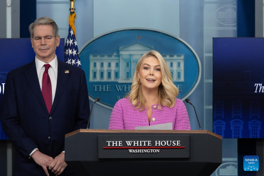 White House Press Secretary Karoline Leavitt (C) speaks during a press briefing alongside U.S. Treasury Secretary Scott Bessent (L, Rear) at the White House in Washington, D.C., the United States, on April 29, 2025. The White House has criticized retail giant Amazon's decision to display tariff costs alongside the price of its products. Responding to a report of the planned Amazon move, White House Press Secretary Karoline Leavitt on Tuesday called the move a "hostile and political act." She made the remark during a press briefing with Treasury Secretary Scott Bessent. (Xinhua/Hu Yousong)