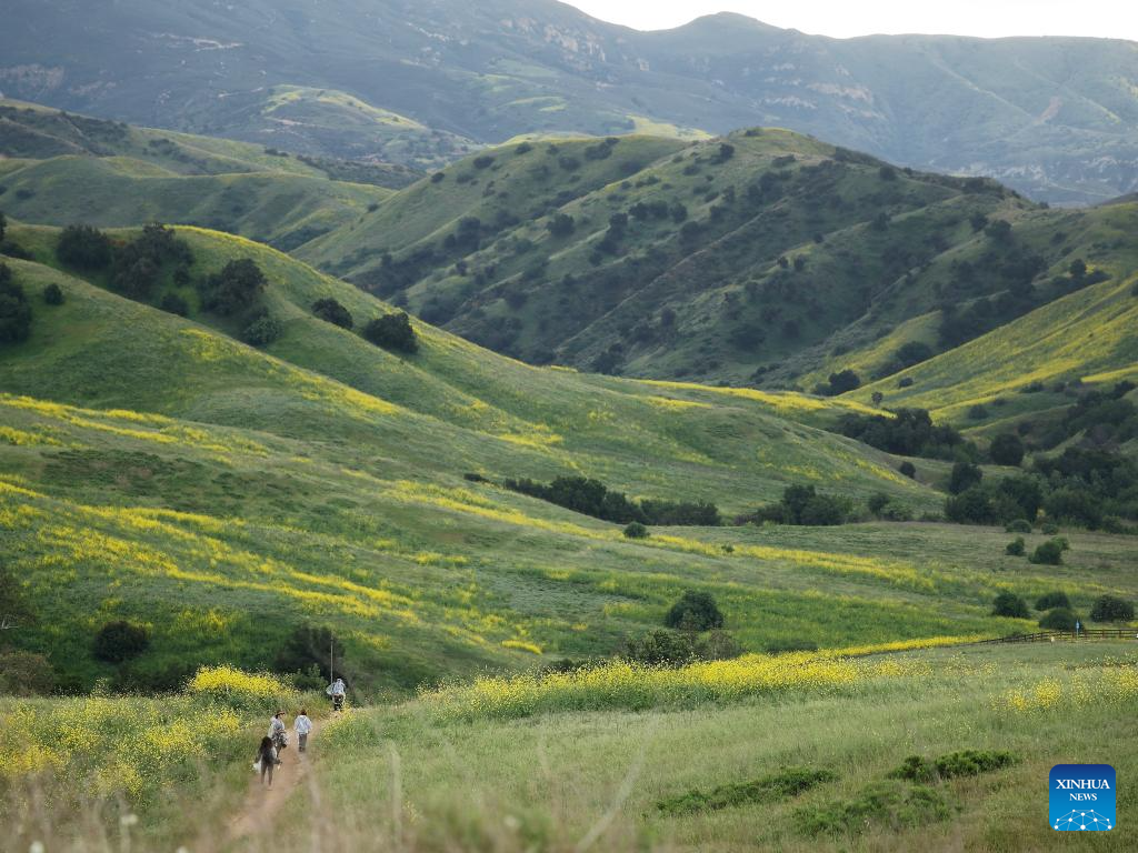 People hike in rolling hills covered with wild flowers at Chino Hills State Park in Chino Hills, California, the United States, on April 27, 2025. (Photo by Qiu Chen/Xinhua)
