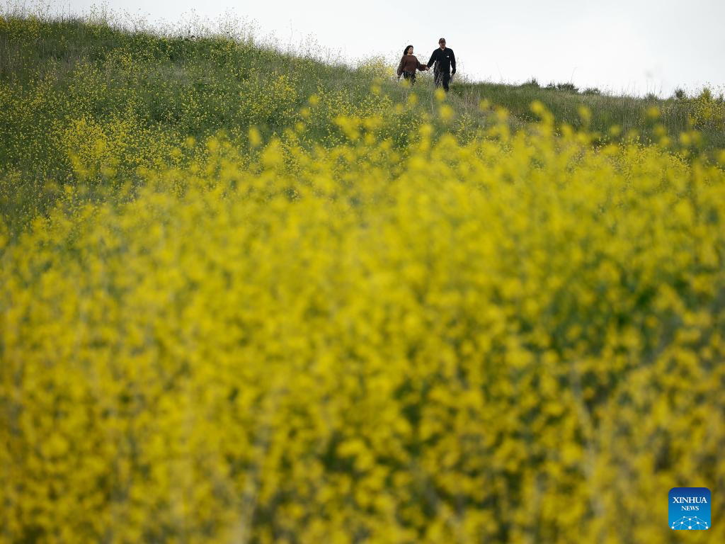 People hike amid wild flowers at Chino Hills State Park in Chino Hills, California, the United States, on April 27, 2025. (Photo by Qiu Chen/Xinhua)