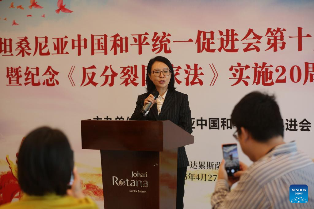 Chen Mingjian, Chinese ambassador to Tanzania, delivers a speech at a meeting commemorating the 20th anniversary of the enforcement of China's Anti-Secession Law in the port city of Dar es Salaam, Tanzania, April 27, 2025. (Xinhua/Emmanuel Herman)
