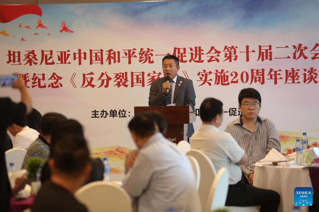 Feng Zhenyu, chairman of the China Council for the Promotion of Peaceful National Reunification in Tanzania, delivers a speech at a meeting commemorating the 20th anniversary of the enforcement of China's Anti-Secession Law in the port city of Dar es Salaam, Tanzania, April 27, 2025. (Xinhua/Emmanuel Herman)