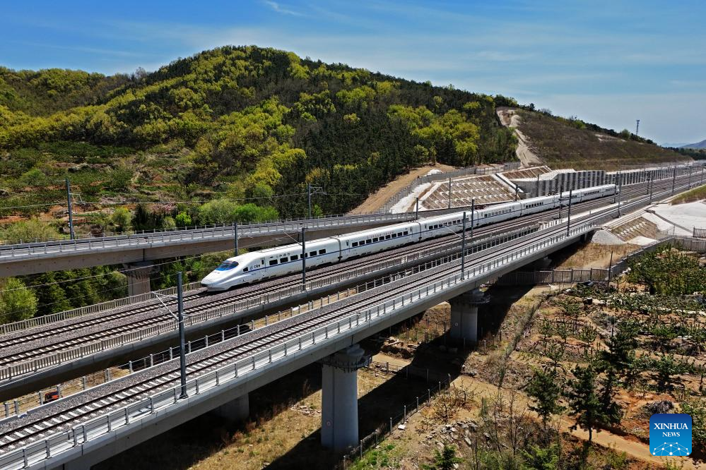 A drone photo shows a bullet train running in Yantai City, east China's Shandong Province, April 29, 2025. China's railway network is expected to handle approximately 144 million passenger trips during the eight-day May Day holiday travel rush, which kicked off on Tuesday, the national railway operator said. (Photo by Sun Wentan/Xinhua)