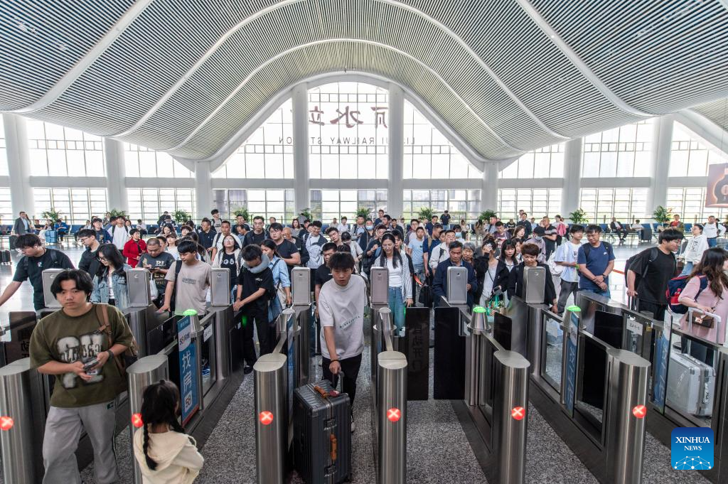 Passengers check in at Lishui Railway Station in Lishui City, east China's Zhejiang Province, April 29, 2025. China's railway network is expected to handle approximately 144 million passenger trips during the eight-day May Day holiday travel rush, which kicked off on Tuesday, the national railway operator said. (Photo by Hu Xiaofei/Xinhua)