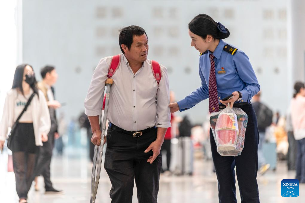 A staff member helps a passenger at Jinhua Railway Station in Jinhua, east China's Zhejiang Province, April 29, 2025. China's railway network is expected to handle approximately 144 million passenger trips during the eight-day May Day holiday travel rush, which kicked off on Tuesday, the national railway operator said. (Photo by Hu Xiaofei/Xinhua)