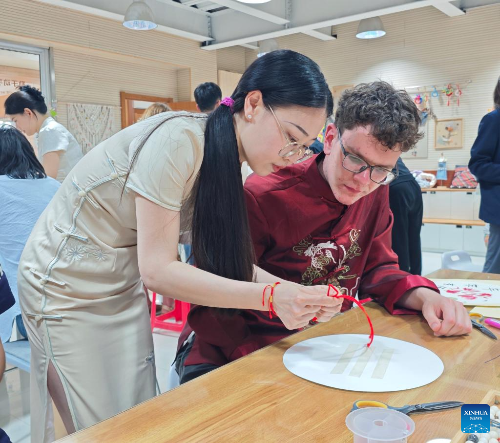 A student from the United States learns to make a Chinese knot during a study tour in Shijiazhuang, north China's Hebei Province, April 26, 2025. (Xinhua/Dong Xiaokun)