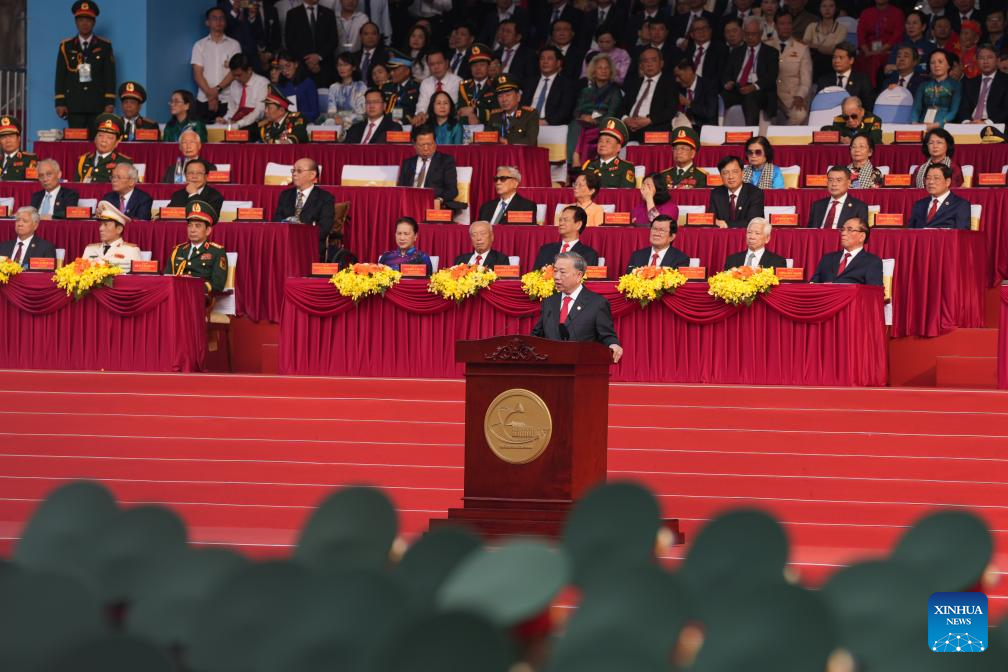 Vietnamese leaders, including General Secretary of the Communist Party of Vietnam Central Committee To Lam, President Luong Cuong, Prime Minister Pham Minh Chinh and Chairman of the National Assembly Tran Thanh Man, attended the event along with representatives from various sectors. (Xinhua/Hu Jiali)