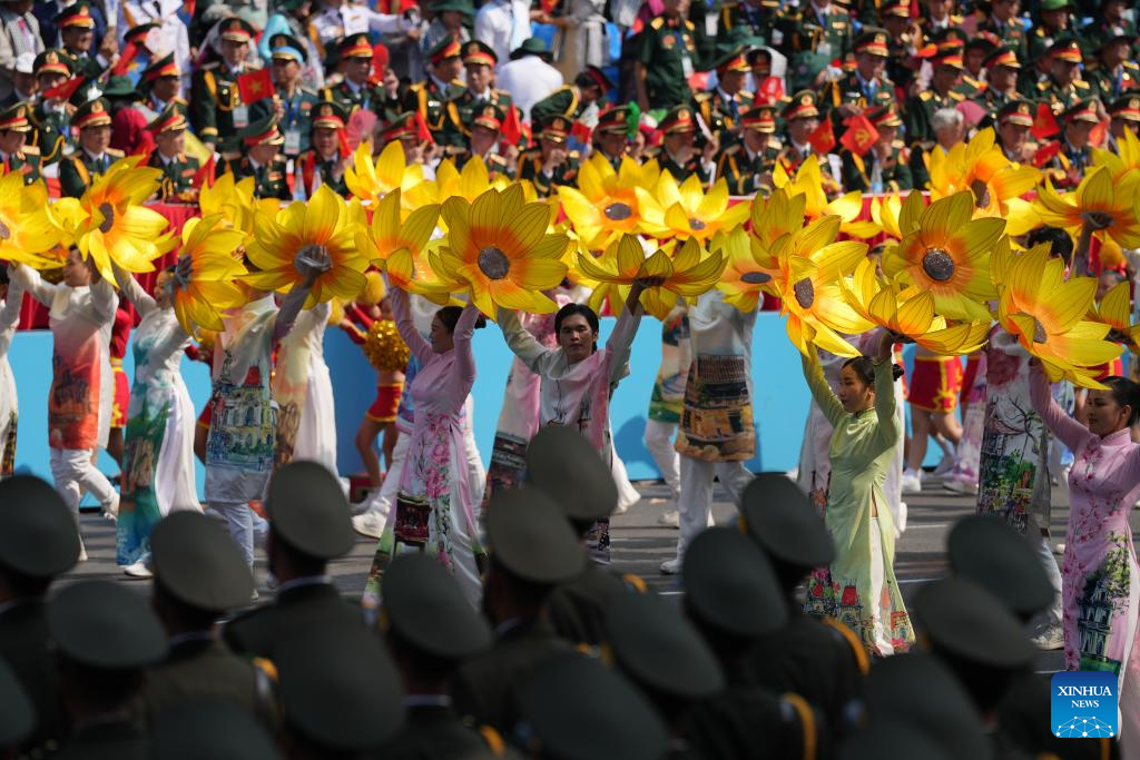 This photo taken on April 30, 2025 shows a scene of a mass march marking the 50th anniversary of the liberation of the South and national reunification in Ho Chi Minh City, Vietnam. Vietnam on Wednesday held a grand ceremony, military parade and mass march in Ho Chi Minh City to mark the 50th anniversary of the liberation of the South and national reunification. Vietnamese leaders, including General Secretary of the Communist Party of Vietnam Central Committee To Lam, President Luong Cuong, Prime Minister Pham Minh Chinh and Chairman of the National Assembly Tran Thanh Man, attended the event along with representatives from various sectors. (Xinhua/Hu Jiali)