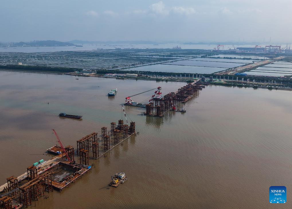 An aerial drone photo taken on April 29, 2025 shows the setting scene of the first steel box girder of Wanlong Grand Bridge in Nansha District of Guangzhou, south China's Guangdong Province. The first steel box girder of Wanlong Grand Bridge, with a length of 5,146 meters, a main bridge of 1,150 meters and a main span of 608 meters, was successfully set on Tuesday. The bridge, located at Guangdong-Hong Kong-Macao Greater Bay Area, is the world's largest-span self-anchored suspension bridge. (Xinhua/Liu Dawei)