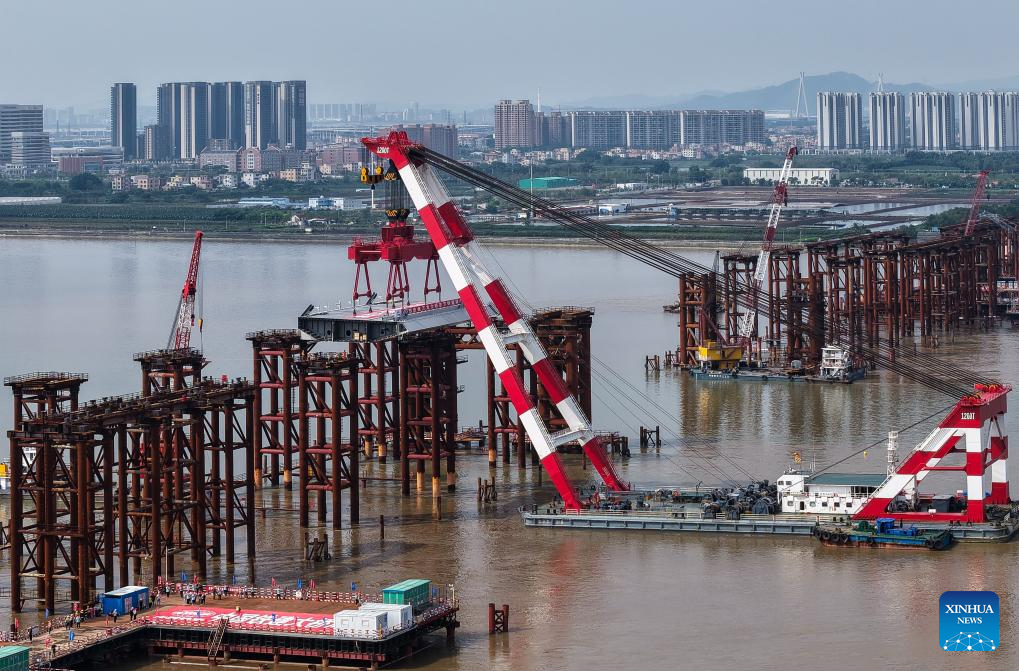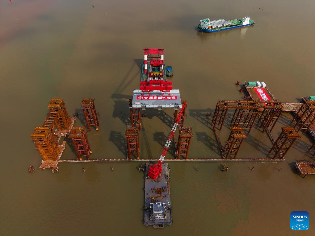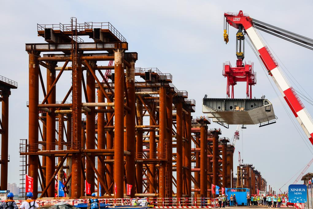 This photo taken on April 29, 2025 shows the setting scene of the first steel box girder of Wanlong Grand Bridge in Nansha District of Guangzhou, south China's Guangdong Province. The first steel box girder of Wanlong Grand Bridge, with a length of 5,146 meters, a main bridge of 1,150 meters and a main span of 608 meters, was successfully set on Tuesday. The bridge, located at Guangdong-Hong Kong-Macao Greater Bay Area, is the world's largest-span self-anchored suspension bridge. (Xinhua/Liu Dawei)