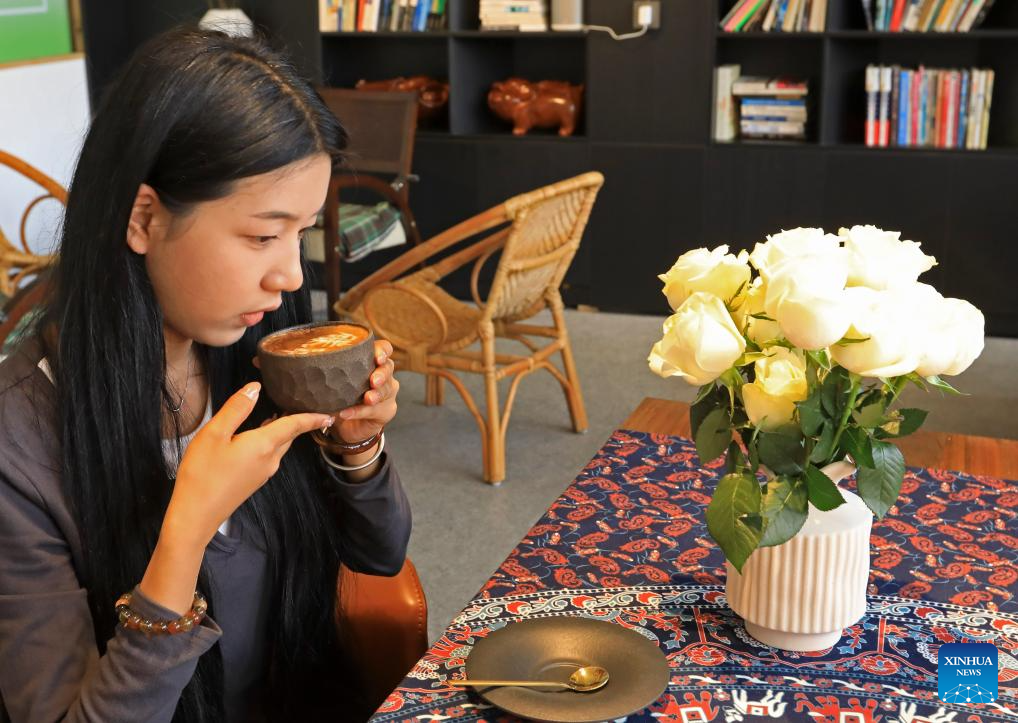 A customer enjoys coffee served in a volcanic rock mug in Tengchong, southwest China's Yunnan Province, April 26, 2025. Home to 99 active and extinct volcanoes, Tengchong is rich in geothermal resources. The city's environment is known by locals as being "half water half fire," a feature that has been utilized to develop tourism. (Xinhua/Liu Lianfen)