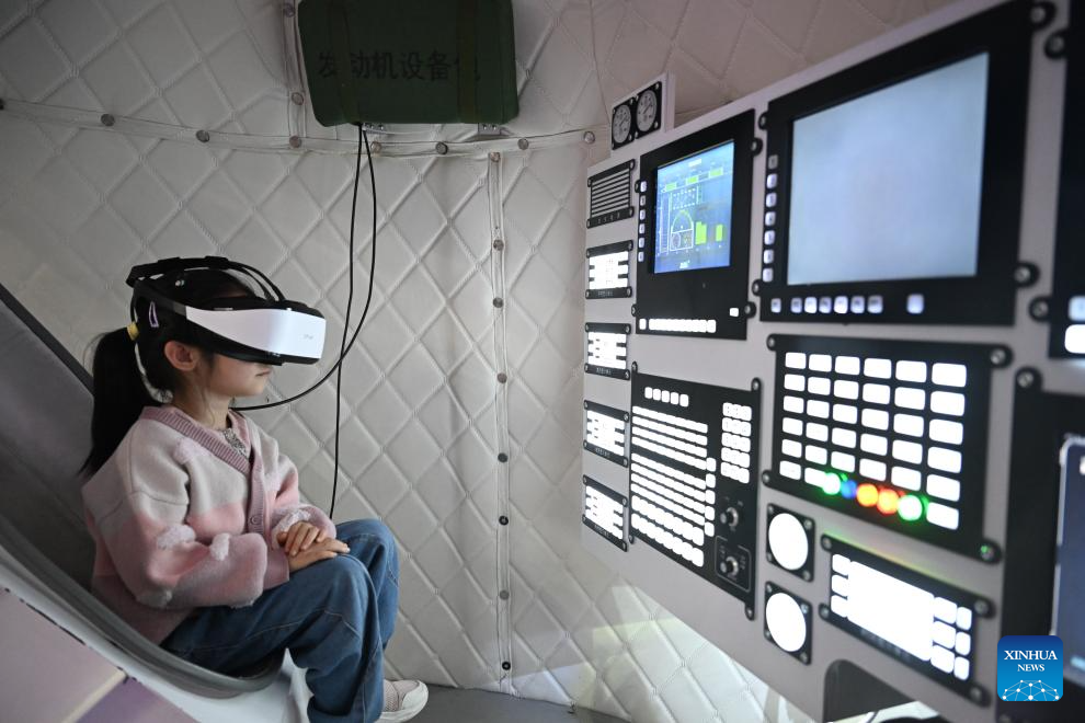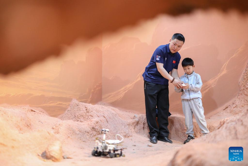 A kid tries a Mars rover module under the guidance of a docent at an aerospace science popularization base in a satellite manufacturing industrial park in Hebi, central China's Henan Province, April 21, 2025.(Xinhua/Du Xiaoyi)