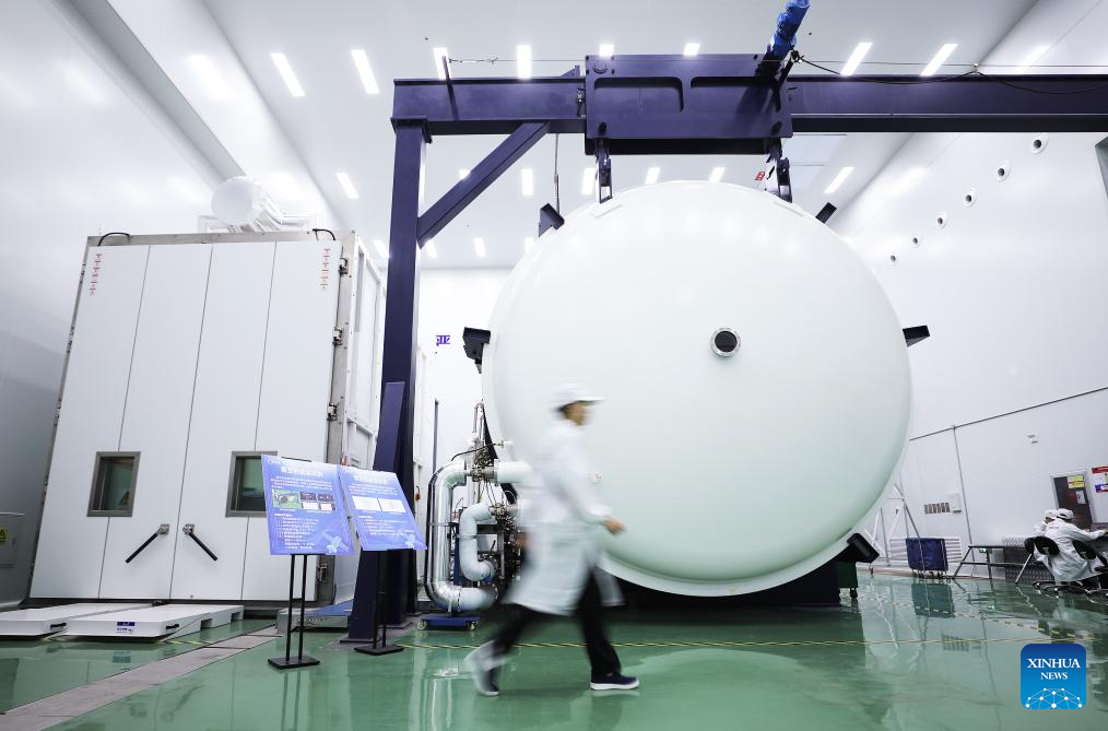 This photo taken on April 21, 2025 shows a view inside a workshop of a satellite manufacturing base in Hebi, central China's Henan Province.(Xinhua/Du Xiaoyi)