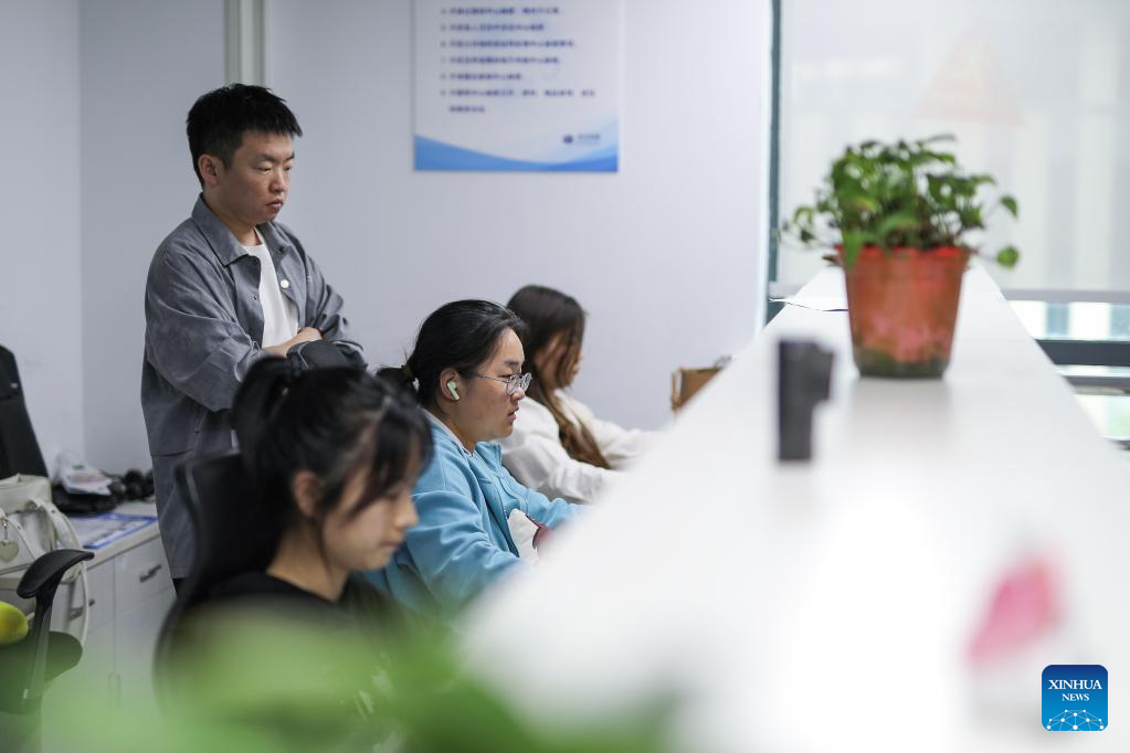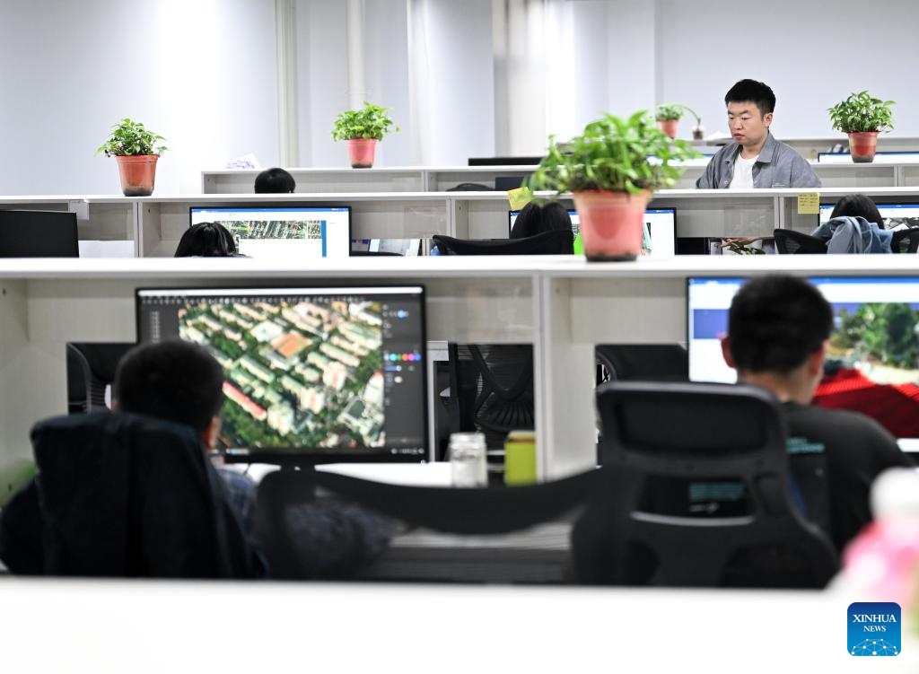 Employees work at a company providing data solutions for satellite internet in Hebi, central China's Henan Province, April 21, 2025.(Xinhua/Du Xiaoyi)