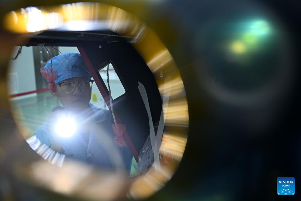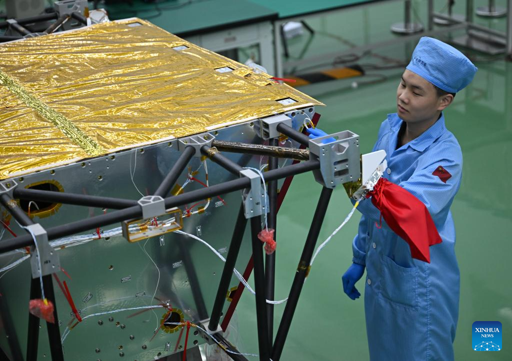 An employee checks the assembly of a satellite at a satellite manufacturing base in Hebi, central China's Henan Province, April 21, 2025.(Xinhua/Li Jianan)