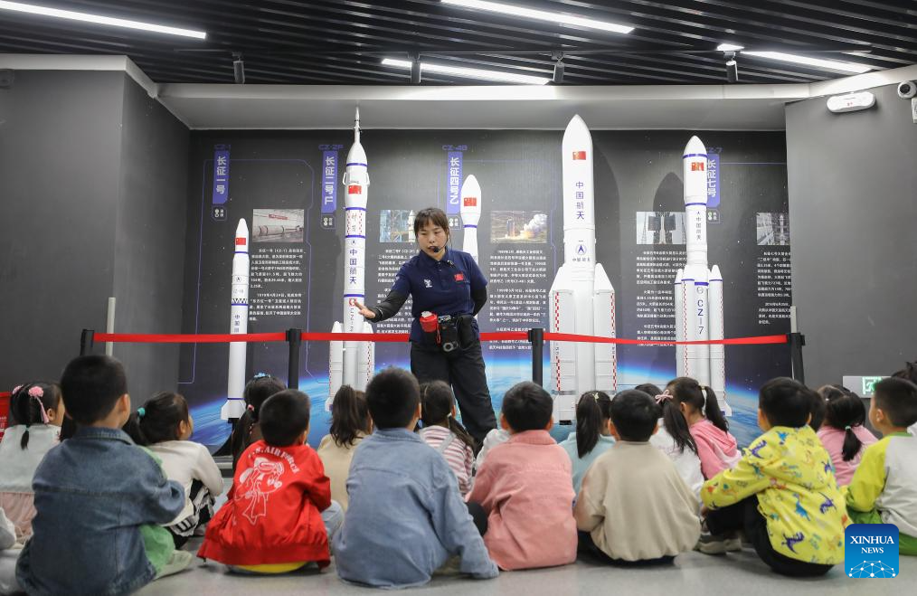 A docent introduces rocket knowledge at an aerospace science popularization base in a satellite manufacturing industrial park in Hebi, central China's Henan Province, April 21, 2025.(Xinhua/Du Xiaoyi)
