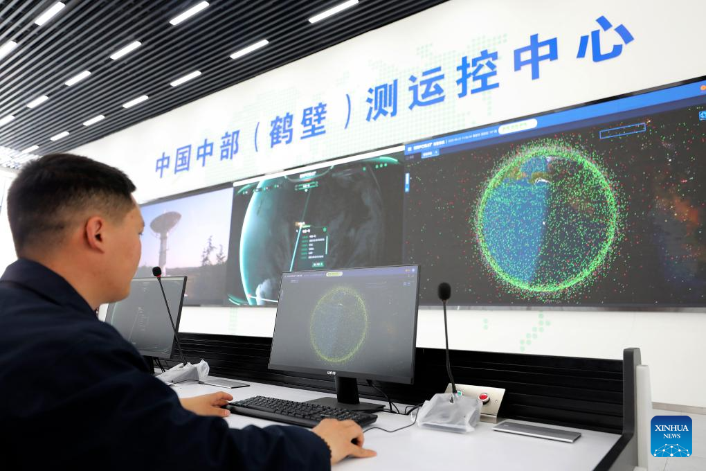An employee monitors operation of satellites at a satellite measurement and control center in Hebi, central China's Henan Province, April 21, 2025.(Xinhua/Du Xiaoyi)