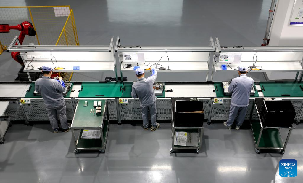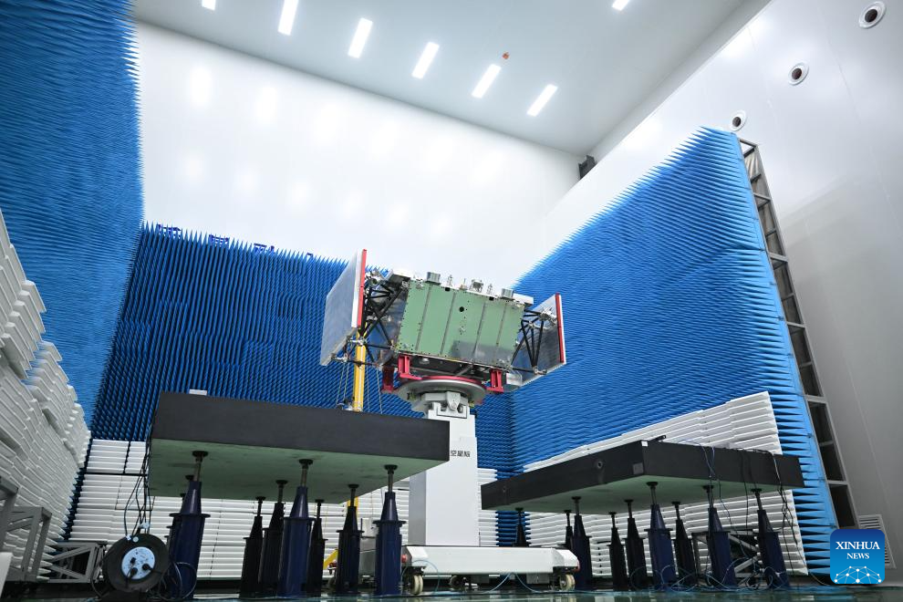 This photo taken on April 21, 2025 shows a view inside a workshop of a satellite manufacturing base in Hebi, central China's Henan Province.(Xinhua/Li Jianan)