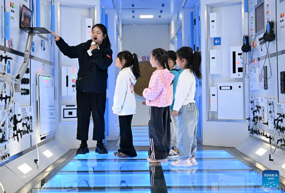 Kids visit a space station model at an aerospace science popularization base in a satellite manufacturing industrial park in Hebi, central China's Henan Province, April 21, 2025.(Xinhua/Li Jianan)