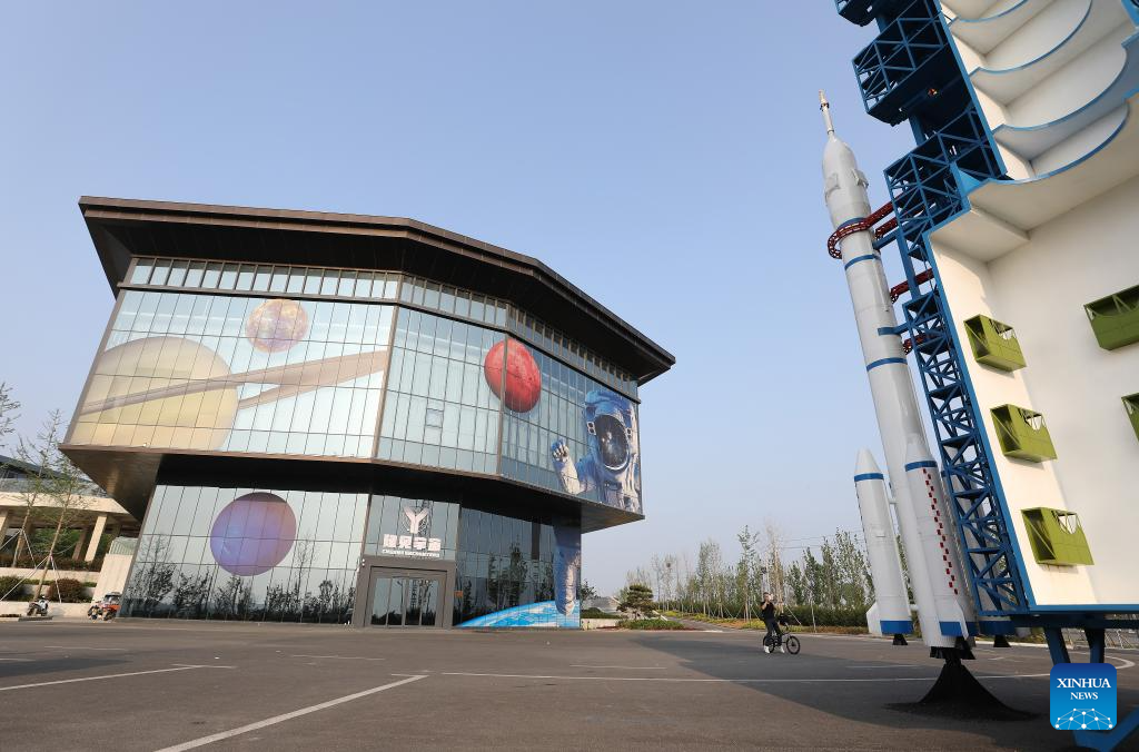 This photo taken on April 20, 2025 shows a view of an aerospace science popularization base in a satellite manufacturing industrial park in Hebi, central China's Henan Province.(Xinhua/Du Xiaoyi)
