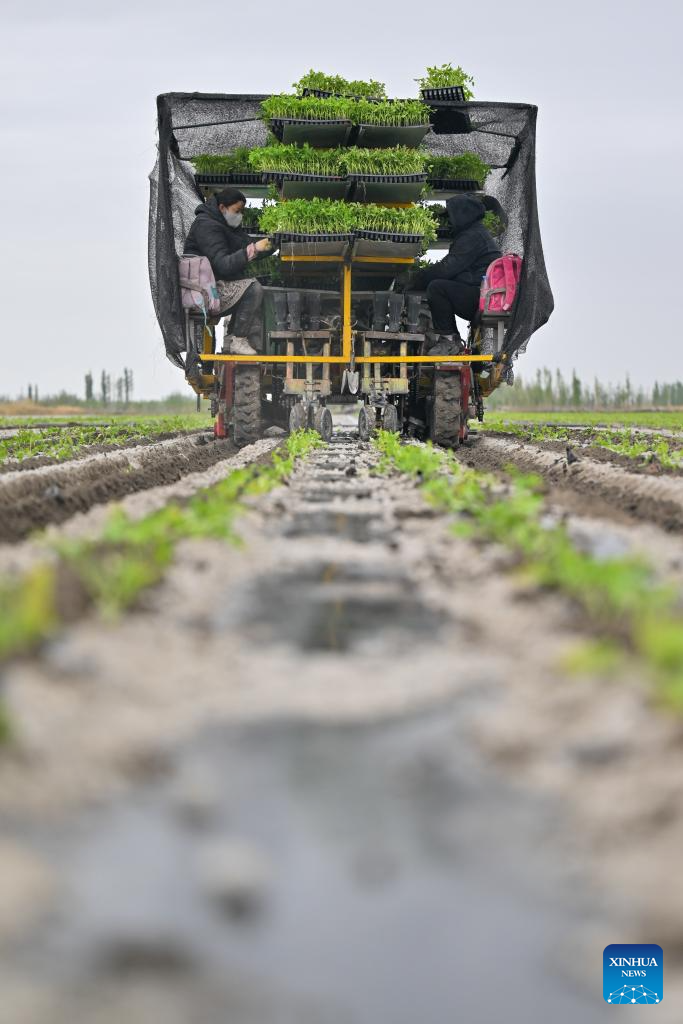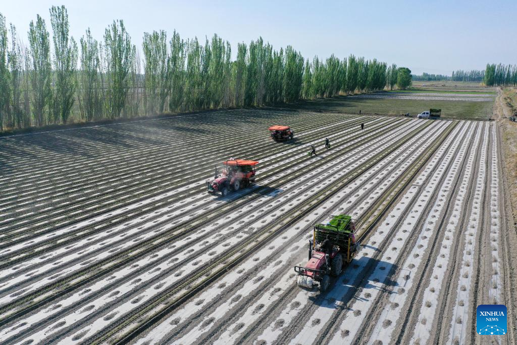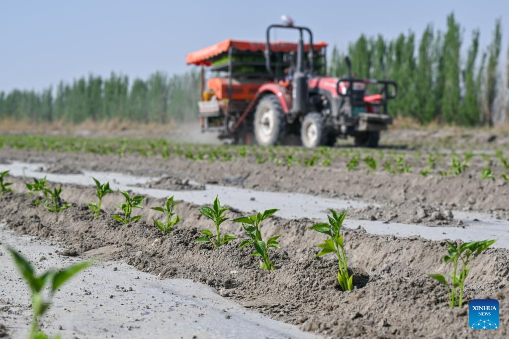 Transplanting machines work in a red pepper field in Bumbut Town, Mongolian Autonomous Prefecture of Bayingolin in northwest China's Xinjiang Uygur Autonomous Region, April 29, 2025. The application of mechanized, intelligent and automated equipment improves the efficiency of local tomato and red pepper planting. (Xinhua/Ding Lei)
