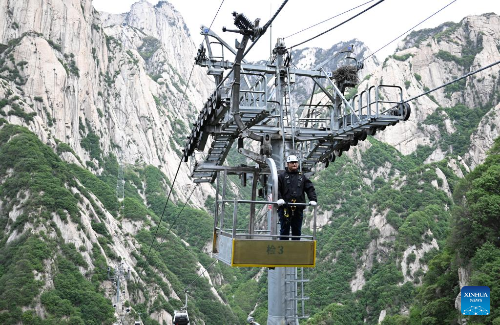 A maintenance worker conducts routine inspection on the sightseeing cableway at the Huashan Mountain scenic area in Weinan, northwest China's Shaanxi Province, April 29, 2025. Boasting precipitous cliffs and beautiful scenery, the Huashan Mountain has attracted a great number of visitors from around the world. With a maximal elevation difference of nearly 900 meters, the mountain's 4,211-meter-long sightseeing cableway has provided an unique travelling experience for tourists and gained popularity since its launch in 2013. For the smooth operation of the cableway, inspection of mechanical parts, electrical systems and communication equipment have become the routine work of maintenance workers every single day. As about 150,000 visits are expected to be made to Huashan during the upcoming May Day holiday, a total of 30 maintenance workers will be on duty to ensure the safe operation of the cableway. (Xinhua/Zhang Bowen)