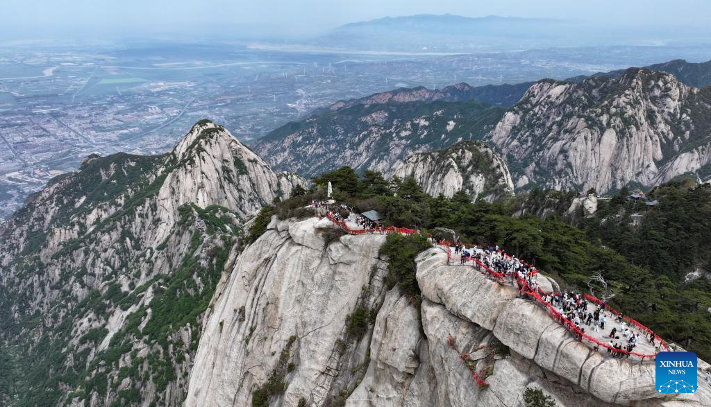 An aerial drone photo taken on April 29, 2025 shows tourists visiting the Huashan Mountain scenic area in Weinan, northwest China's Shaanxi Province. Boasting precipitous cliffs and beautiful scenery, the Huashan Mountain has attracted a great number of visitors from around the world. With a maximal elevation difference of nearly 900 meters, the mountain's 4,211-meter-long sightseeing cableway has provided an unique travelling experience for tourists and gained popularity since its launch in 2013. For the smooth operation of the cableway, inspection of mechanical parts, electrical systems and communication equipment have become the routine work of maintenance workers every single day. As about 150,000 visits are expected to be made to Huashan during the upcoming May Day holiday, a total of 30 maintenance workers will be on duty to ensure the safe operation of the cableway. (Xinhua/Zhang Bowen)