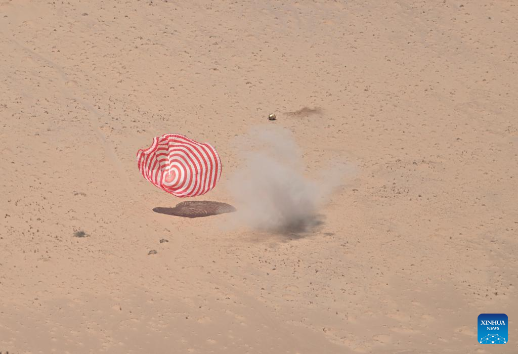 JIUQUAN, April 30 (Xinhua) -- The return capsule of the Shenzhou-19 crewed spaceship, carrying astronauts Cai Xuzhe, Song Lingdong and Wang Haoze, touched down at the Dongfeng landing site in north China's Inner Mongolia Autonomous Region on Wednesday.