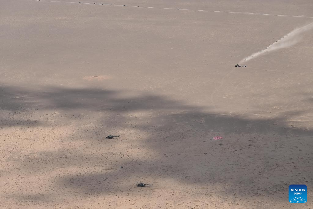 The return capsule of the Shenzhou-19 crewed spaceship, carrying astronauts Cai Xuzhe, Song Lingdong and Wang Haoze, is about to touch down at the Dongfeng landing site in north China's Inner Mongolia Autonomous Region, April 30, 2025. The three astronauts are all in good health condition, according to the China Manned Space Agency. (Xinhua/Li Xin)