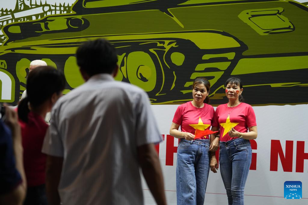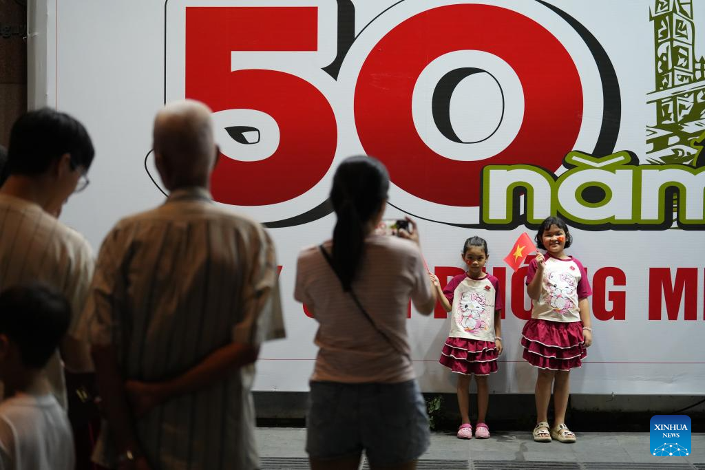 This photo taken on April 29, 2025 shows people posing for photos at Nguyen Hue Walking Street in Ho Chi Minh City, Vietnam. Vietnam is in the final stage of preparations for a grand ceremony commemorating the 50th anniversary of the Liberation of the South and National Reunification, set to take place on Wednesday, local media reported. (Xinhua/Hu Jiali)