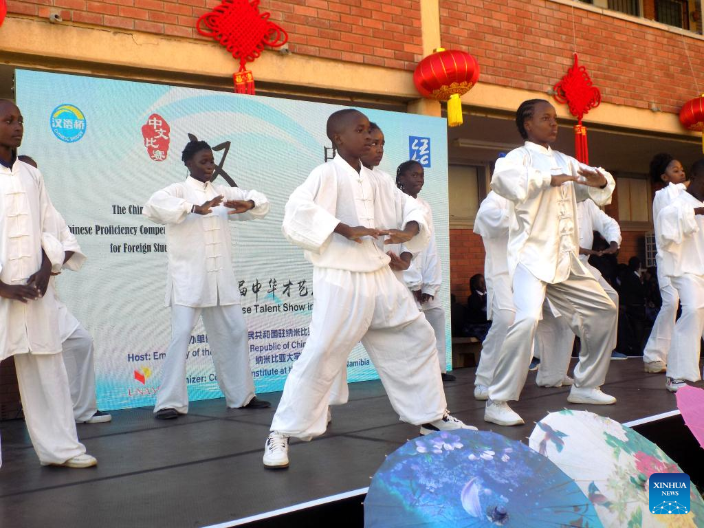 Namibian students perform Chinese martial arts during the Chinese Talent Show, part of the Chinese language competition, in Windhoek, Namibia, April 29, 2025. Hosted by the Chinese Embassy in Namibia and organized by the Confucius Institute at the University of Namibia (UNAM), the event marked part of UNAM's celebrations for the Chinese Language Day, observed annually around April 20. The competition showcased Namibian students' talents in Chinese literature, poetry, and language, underscoring the deepening cultural ties between the two countries.(Photo by Musa Kaseke/Xinhua)