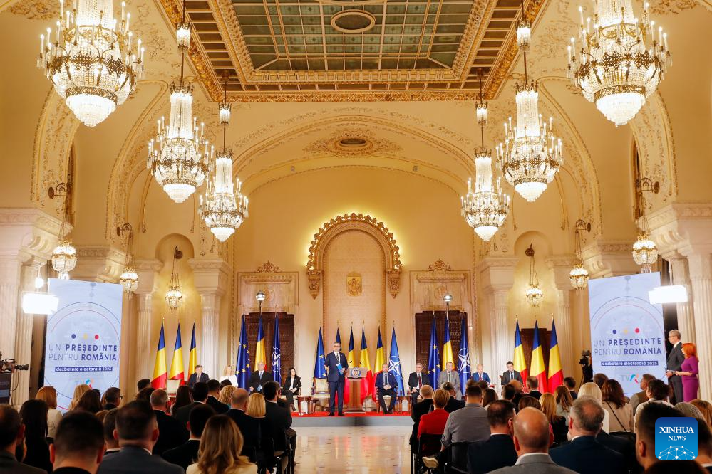 Candidates for Romania's presidency attend an electoral debate organised by Romania's state television channel at the Cotroceni palace in Bucharest, Romania, April 29, 2025. Romanians will vote in the first round of presidential elections on May 4. (Photo by Cristian Cristel/Xinhua)