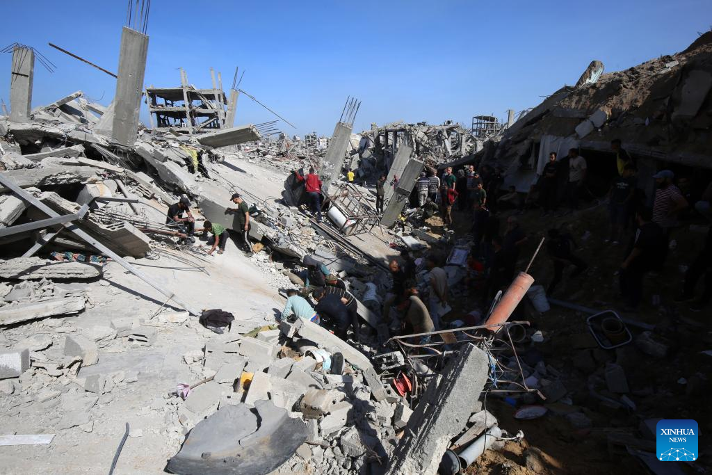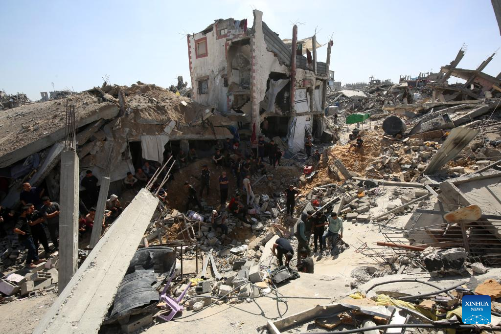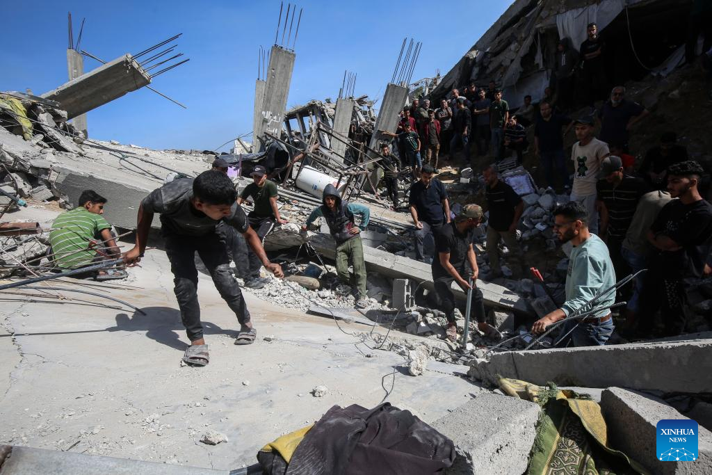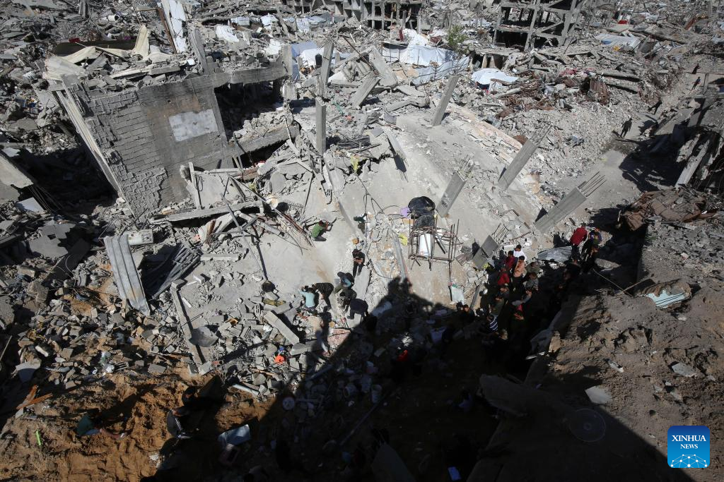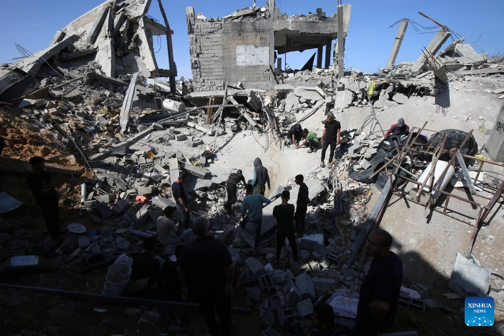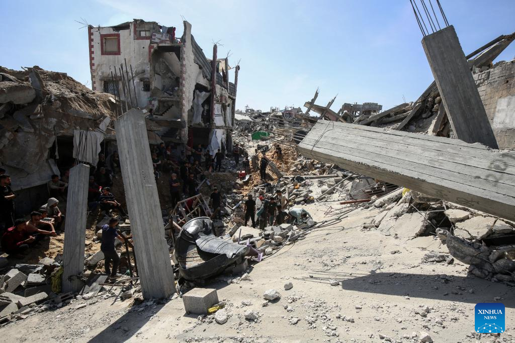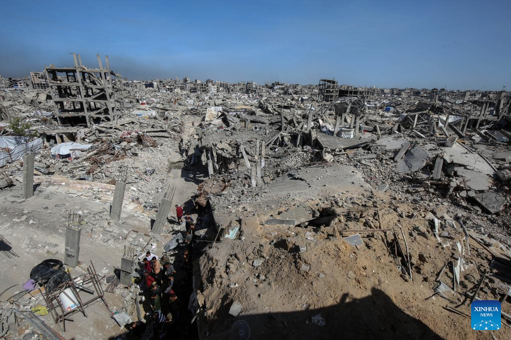Palestinians inspect destroyed buildings after an Israeli airstrike in Jabalia refugee camp, northern Gaza Strip, on May 16, 2025. (Photo by Rizek Abdeljawad/Xinhua)